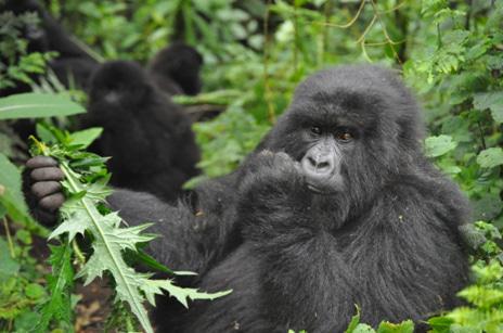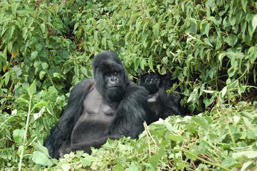 Hope then suggested we walk a bit further where we could view the massive Silverback of this clan. Again the group descended single file down the hill with me in the rear and it was at this time that I had a bit of a scare when a rustling of the bushes to my rear was accompanied by the blur of a black object, about chest high coming straight for me with some speed. There was no doubt what it was and perhaps my inability to get out of the way surprised the gorilla but as he came to me he took a swing at me and hit me in the rib cage. Obviously startled, I did not know what to make of the incident but Hope reacted quickly and got between me and the gorilla which did not move but 3 feet from me following the encounter. Hope assured me the gorilla meant no harm and was playing because if he did mean harm he would have broken my ribs. I thought this summary made perfect sense to me and as quickly as my blood pressure rose it dropped again due to some swift action and proper coaching from Hope.
