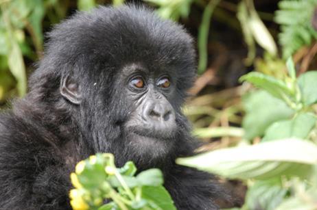 Once I saw the rear of the group again they were stopped and I saw why. There in front of us were two gorillas – one adolescent and a baby estimated at a year old – playing in the grassy floor not 10 feet from us. They were aware of our presence occasionally looking over to see who and what we were. Because these gorilla families are likely to see humans for one hour of each day they have become accustomed to our presence. I remembered the sting of the nettles in my left hand as I reached for my camera but the feeling reminded me that these animals were rolling around in the same plants which created my currently pained condition. The two were rolling around on top of one another and paying no attention to the plants or trees nearby other than to use them as toys along the way.