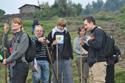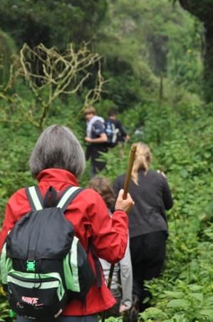 The Mountain Gorilla lives in habitat up to 4,000 feet in dense jungle and to greatly augment our chance of sightings, as well as to protect these endangered species from poachers, park trackers go into the jungle in the early morning and see if they can find the gorillas. Hope told us our family of gorillas had been found so we headed up further through plowed fields of potatoes and cabbage interspersed with modest, mud hut dwellings along the way. On the way up I had a chance to speak with everyone in the group. The honeymoon couple were, as I said French speaking Swiss, but obviously well versed in German however they told me that they were more comfortable speaking English for business and personal needs after French. I would have assumed German would be next on their list of languages. Klaus and Ute are both 60 and the parents of 5 children and he is a family doctor just outside Reimstad, Germany, the US military base there.