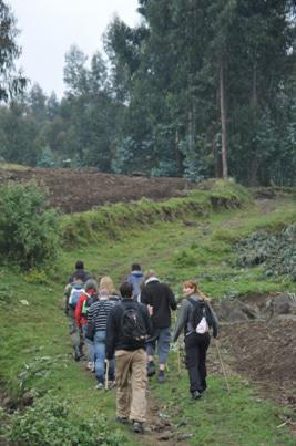Hope took us through a 20 minute or so talk about the specifics of our climb and where we shared a bit about ourselves, too. We then took a short ride down the road and entered the starting point of our climb at a local village. All along the way, again, the children poured out of their homes and from school playgrounds to wave hello. Another sign of a responsible effort on the part of the Rwandan government and guides was Hope telling us not to offer the children free items such as pens, food or money because they would then associate tourists with handouts and the president of the country did not want these children tempted to quit school.