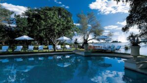 The Royal Livingstone at the Victoria Falls in Zambia is perfect for the discerning traveller in search of luxury, extravagance, indulgence and a myriad of activities. This iconic hotel is spectacularly set in a lush riverine environment and maintains an air of sophistication often associated with a bygone era. The hotel stretches along the banks of the Zambezi River, just a short walk to the entrance of The Victoria Falls. The Royal Livingstone Hotel is named in honor of the explorer Dr. David Livingstone, and it’s interior design reflects the elegance of days gone by using an African architectural style. The Royal Livingstone Hotel comprises 173 spacious en-suite guestrooms, each with its own private veranda, stretched along the river bank.